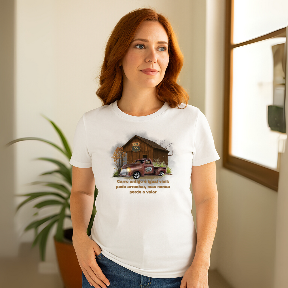 Se tem algo que nunca sai de moda, é a combinação entre estilo e nostalgia. A camiseta Clássico como Vinil traz uma estampa cheia de personalidade: uma charmosa caminhonete antiga, marcada pelo tempo mas carregada de história, em frente ao celeiro do lendário KM 55 Além da Estrada. A frase estampada traduz a essência dessa paixão: “Carro antigo é igual vinil: pode arranhar, mas nunca perde o valor.”