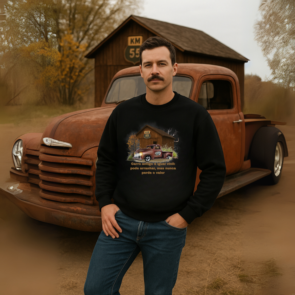 O moletom Clássico como Vinil da KM55 é feito para os apaixonados por carros antigos e pela nostalgia que nunca sai de moda. Com a frase “Carro antigo é igual vinil: pode arranhar, mas nunca perde o valor”, a estampa traz a alma do colecionador que entende que algumas histórias são eternas.