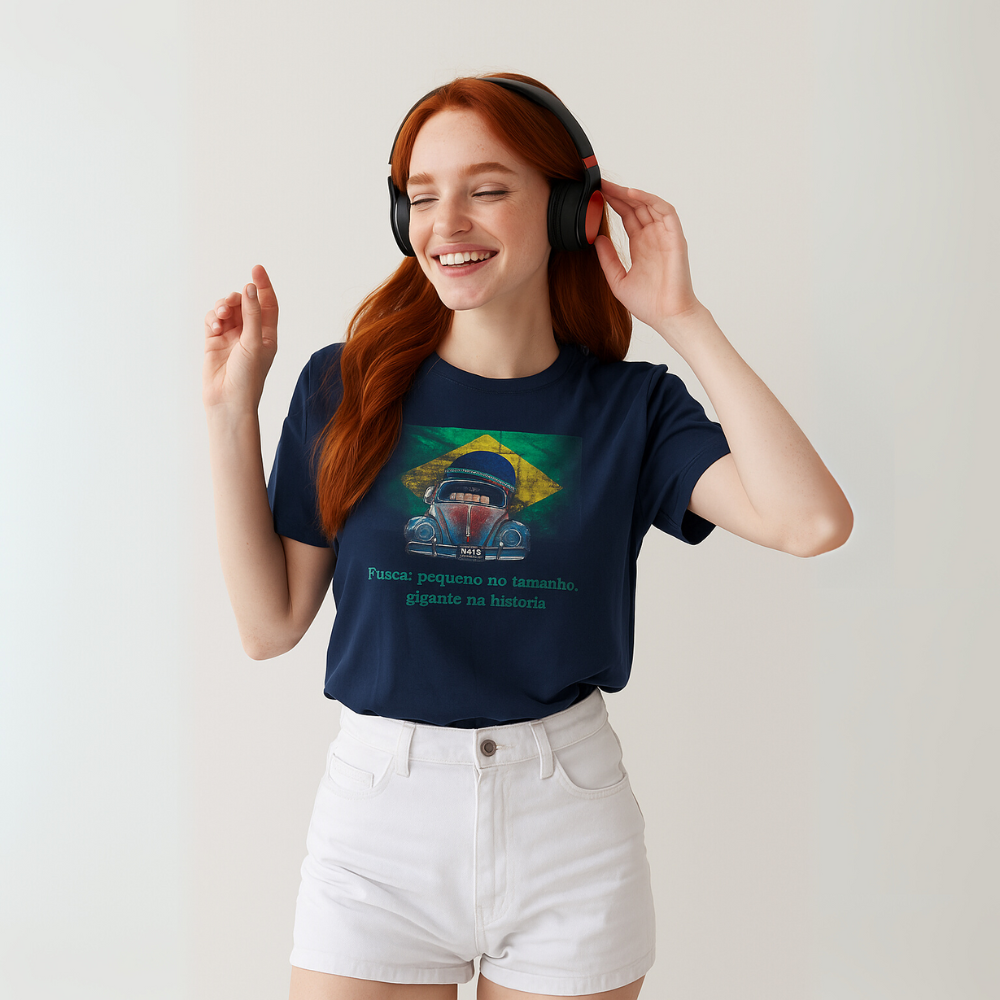 Quando o assunto é paixão nacional, o Fusca não pode faltar. Nesta camiseta, ele aparece imponente à frente da bandeira do Brasil — símbolo de uma história que atravessa gerações e que mora no coração dos brasileiros.