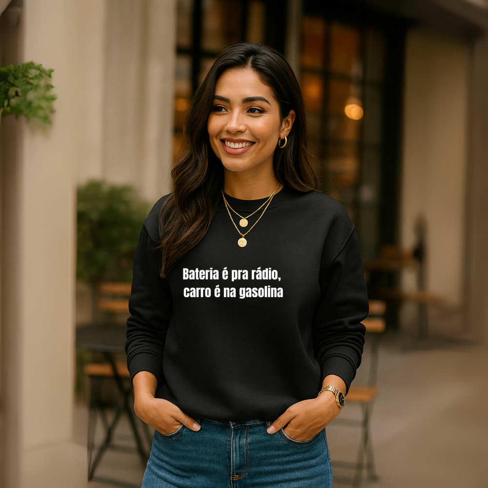 O moletom Bateria é para rádio – KM55 é feito para quem acredita que carro de verdade tem cheiro de gasolina e alma de estrada. Com a frase impactante “Bateria é pra rádio, carro é na gasolina”, essa peça traz irreverência, autenticidade e paixão automotiva no melhor estilo retrô.