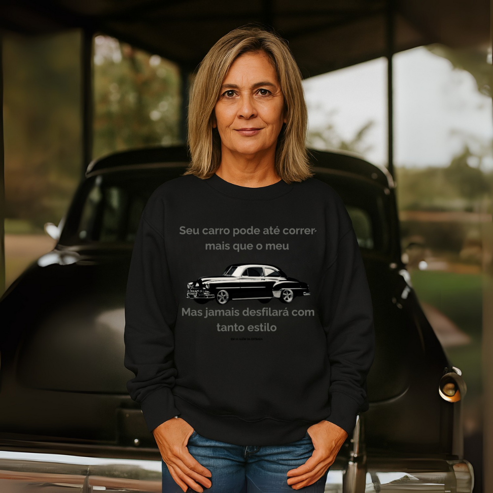 Moletom KM55 – Clássico com Estilo é feito para quem sabe que carros antigos não são apenas máquinas, mas ícones que carregam história e atitude. A estampa traz a frase “Seu carro pode até correr mais que o meu, mas jamais desfilará com tanto estilo”, acompanhada de um clássico automotivo que simboliza elegância e personalidade.