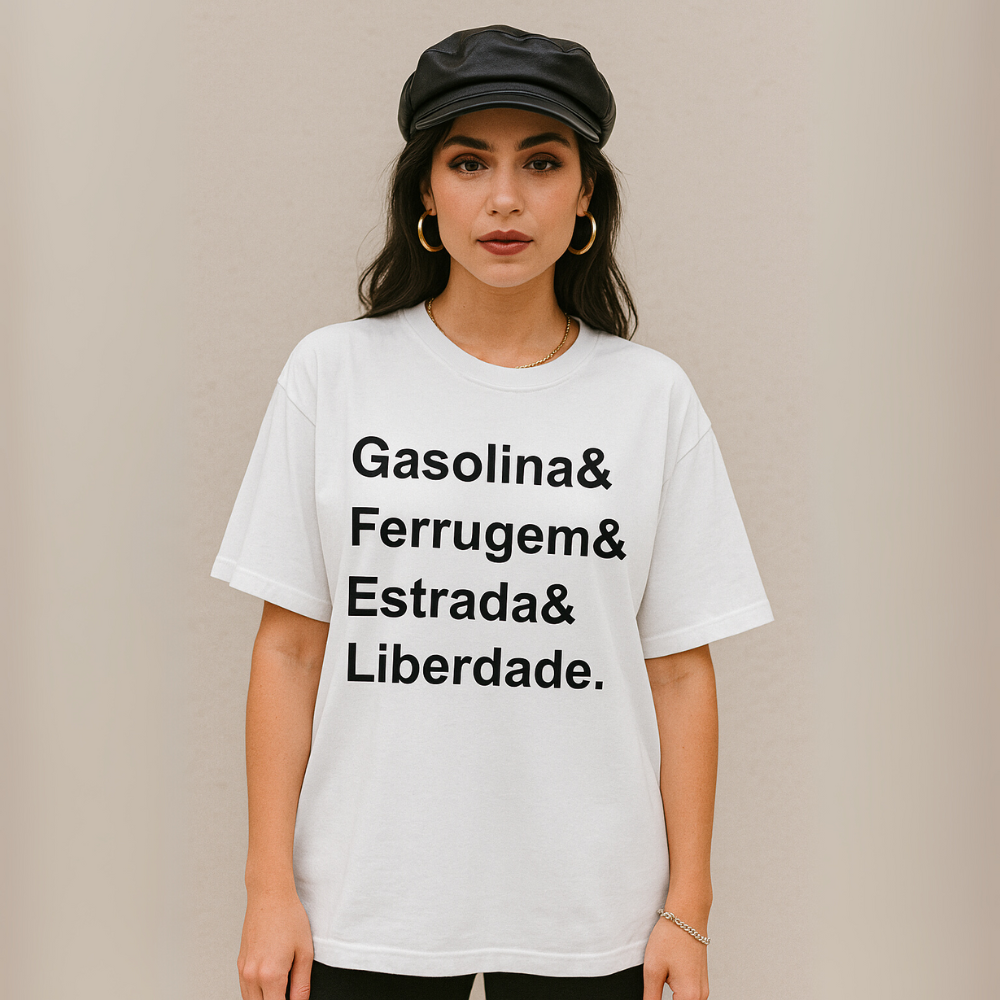 A Camiseta Oversized “Gasolina & Ferrugem & Estrada & Liberdade” é a tradução perfeita do espírito livre de quem vive a estrada. Com estampa tipográfica marcante, essa peça transmite autenticidade, atitude e paixão pelo lifestyle automotivo.