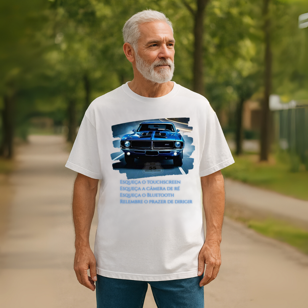 Camiseta Oversized “Prazer de Dirigir” celebra a essência pura da condução clássica. A estampa traz um icônico muscle car em destaque, acompanhado da frase que convida a esquecer a tecnologia moderna e relembrar o verdadeiro prazer de dirigir. Uma homenagem à autenticidade e ao espírito livre da estrada.