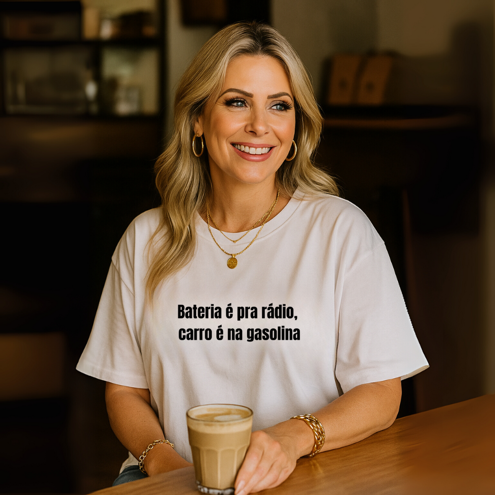A Camiseta Oversized Bateria é pra Rádio é feita para quem não abre mão do ronco de um motor a combustão! A estampa traz em destaque a frase icônica — “Bateria é pra rádio, carro é na gasolina” — com aquele humor nostálgico que só quem ama carros clássicos entende.