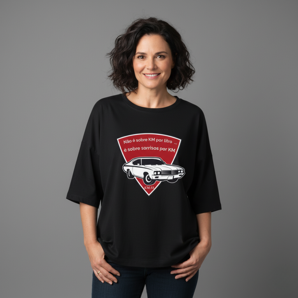 Camiseta Oversized “Sorrisos por KM” celebra o verdadeiro espírito de quem ama estar na estrada. A estampa traz o clássico escudo KM55 com um carro icônico e a frase: “Não é sobre KM por litro… é sobre sorrisos por KM”. Uma mensagem que vai além dos números, exaltando a paixão e a liberdade de dirigir.