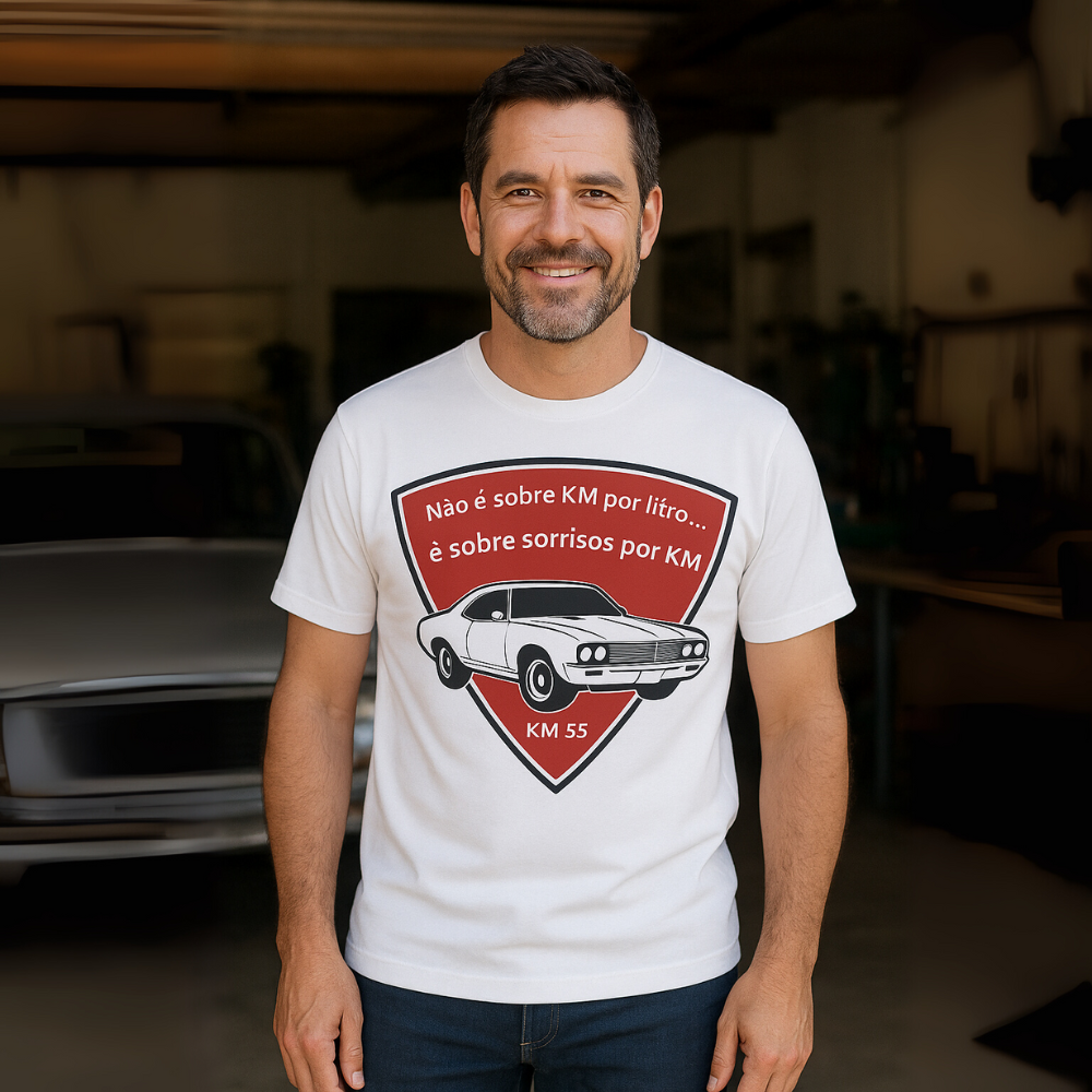 A Camiseta Sorrisos por KM foi criada para quem entende que carro clássico não é sobre quantos quilômetros faz por litro, mas sim sobre quantas emoções entrega a cada viagem. A estampa, inspirada em brasões automobilísticos, traz a frase “Não é sobre KM por litro… é sobre sorrisos por KM”, junto ao desenho de um muscle car icônico, representando liberdade, potência e paixão.